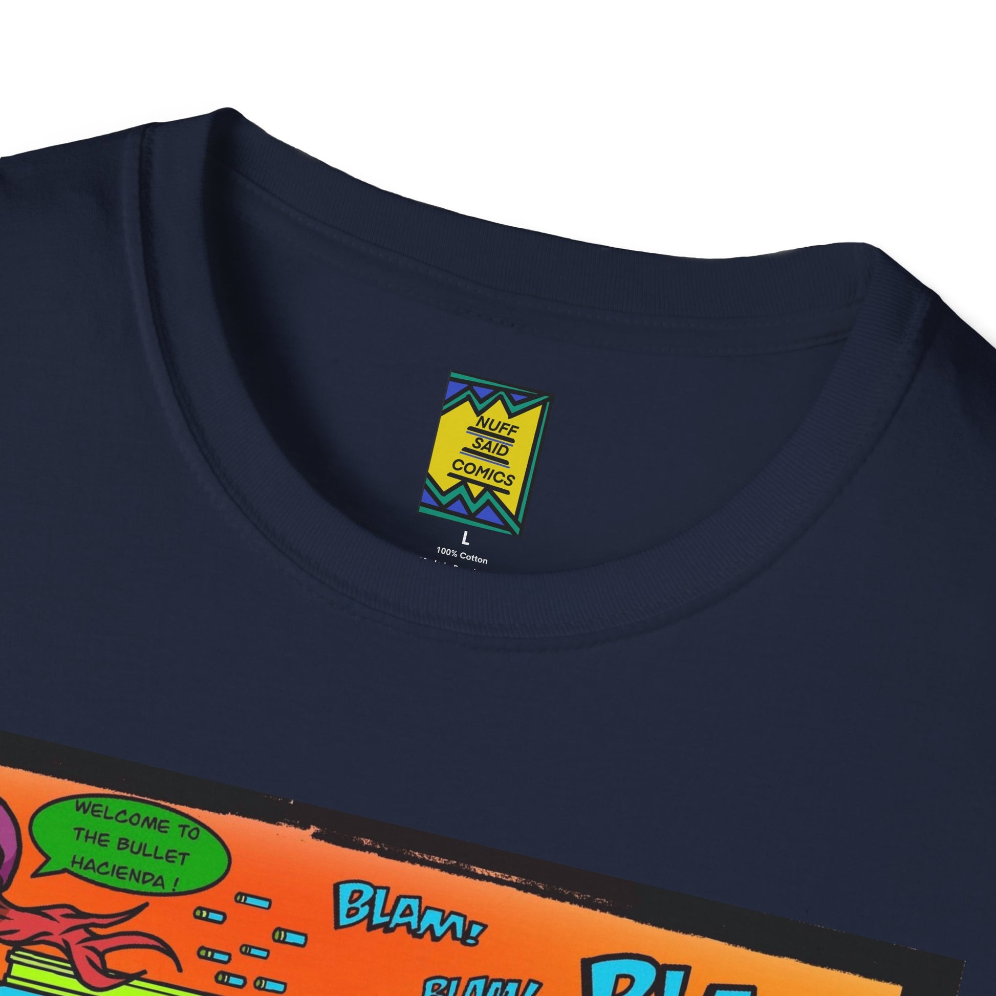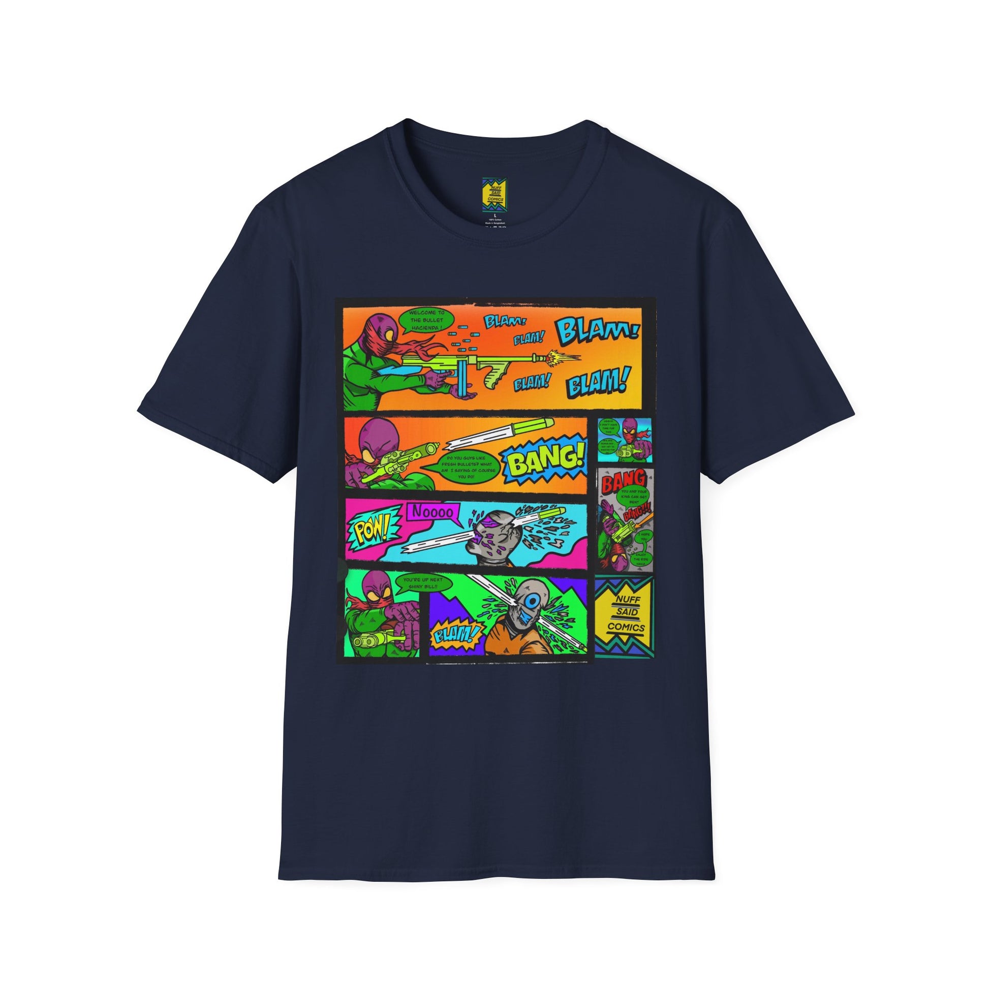 Bright, comic-book energy printed on a soft, breathable tee. Bold panels and neon hues bring a playful action-scene to life — blam, bang, pow — with a masked bounty hunter at the center. The lightweight cotton feels easy on the skin and drapes casually for everyday wear, while stable shoulder tape and a ribbed collar keep this shirt looking sharp after repeat wear. Wear it when you want to channel nostalgic pop-art vibes, stand out in a crowd, or add a splash of color to streetwear layers.