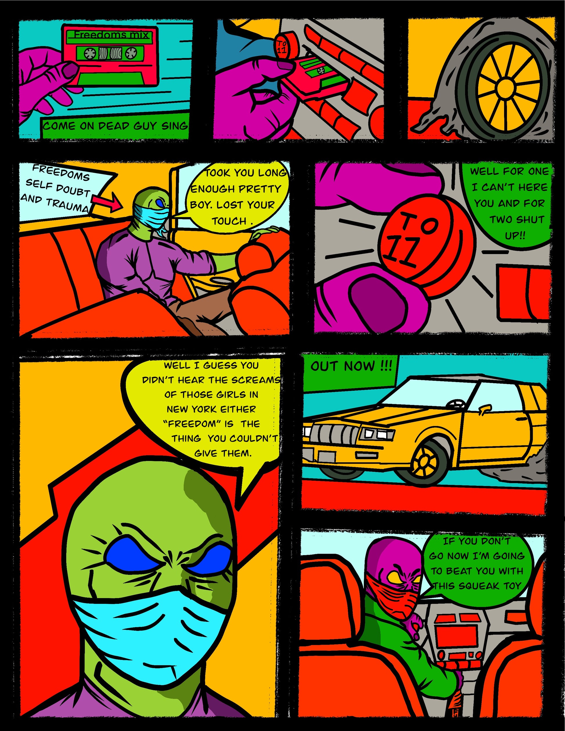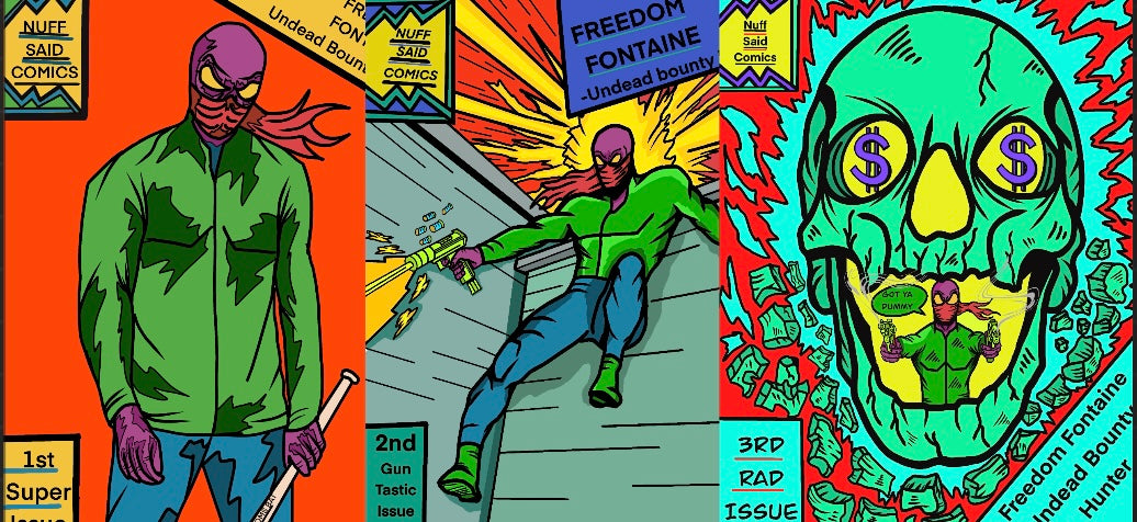 The first three issues of freedom Fontaine undead bounty hunter Join freedom Fontaine undead bounty hunter he is a bounty hunter on the search for his mothers soul but also is a part time wine taster hangs out with a squeaky toy hamburger and the physical embodiment of his self loathing and trauma . He runs into demons and robots and mummy’s along the way . If you like dead pool spiderman , or the punisher mixed with supernatural this is for you