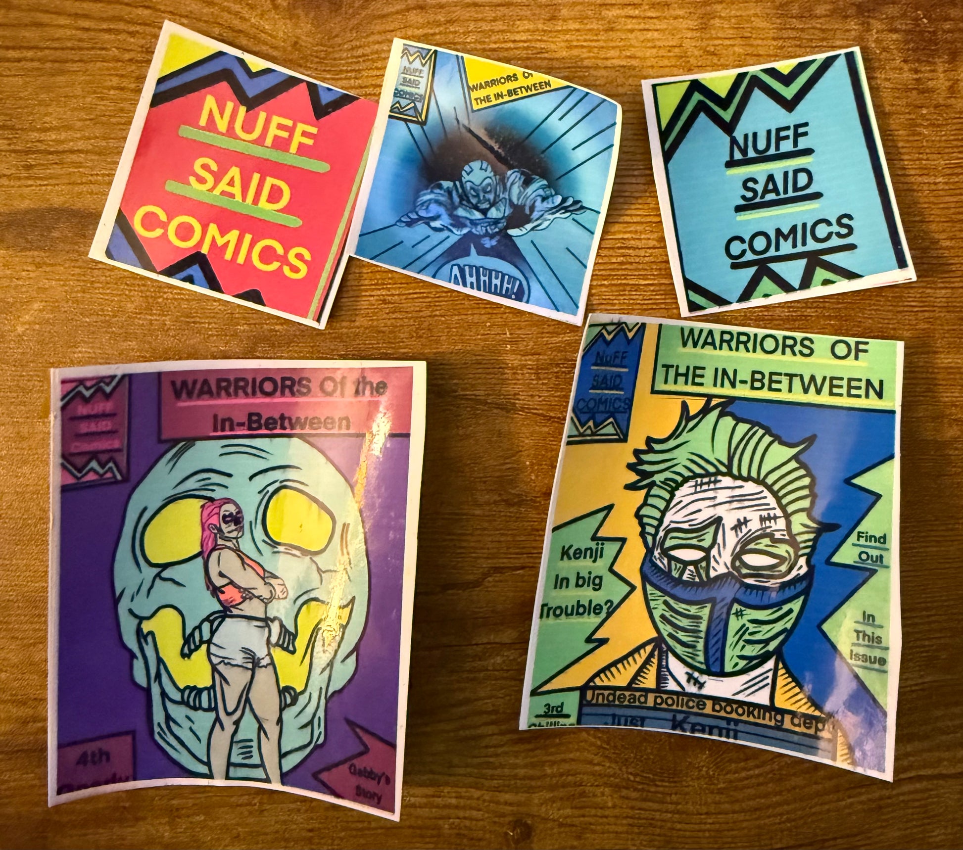 All five issues of warriors of the in-between the story where you can become a super hero after you passaway. Hand selected by the grim reaper himself . Jump into this undead super hero adventure with all five issues , stickers and a keychain written and illustrated by colin hawkins at nuff said comics
