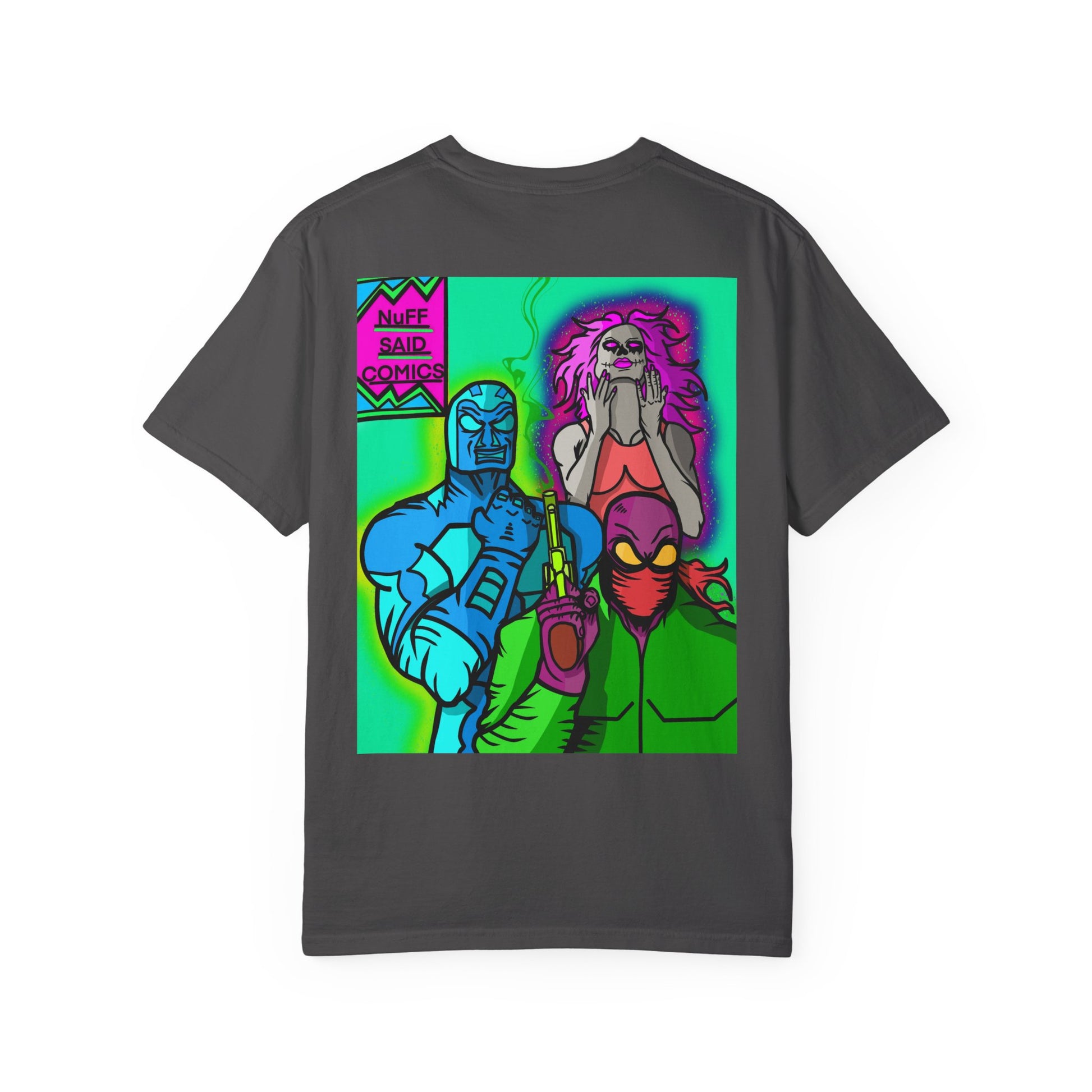 A garment-dyed cotton tee that wears in like an old favorite and carries a bold, comic-inspired scene across front and back. The relaxed fit and medium-weight fabric make it comfortable for layered looks or solo wear. Vivid, hand-drawn superhero imagery — neon outlines, dramatic poses, and a slightly gritty pop-art palette — gives the shirt a streetwise, collectible feel. It’s the shirt for someone who loves loud, graphic storytelling: slide it on, and you’re wrapped in a miniature comic spread that sparks conversation and stands out in a crowd.